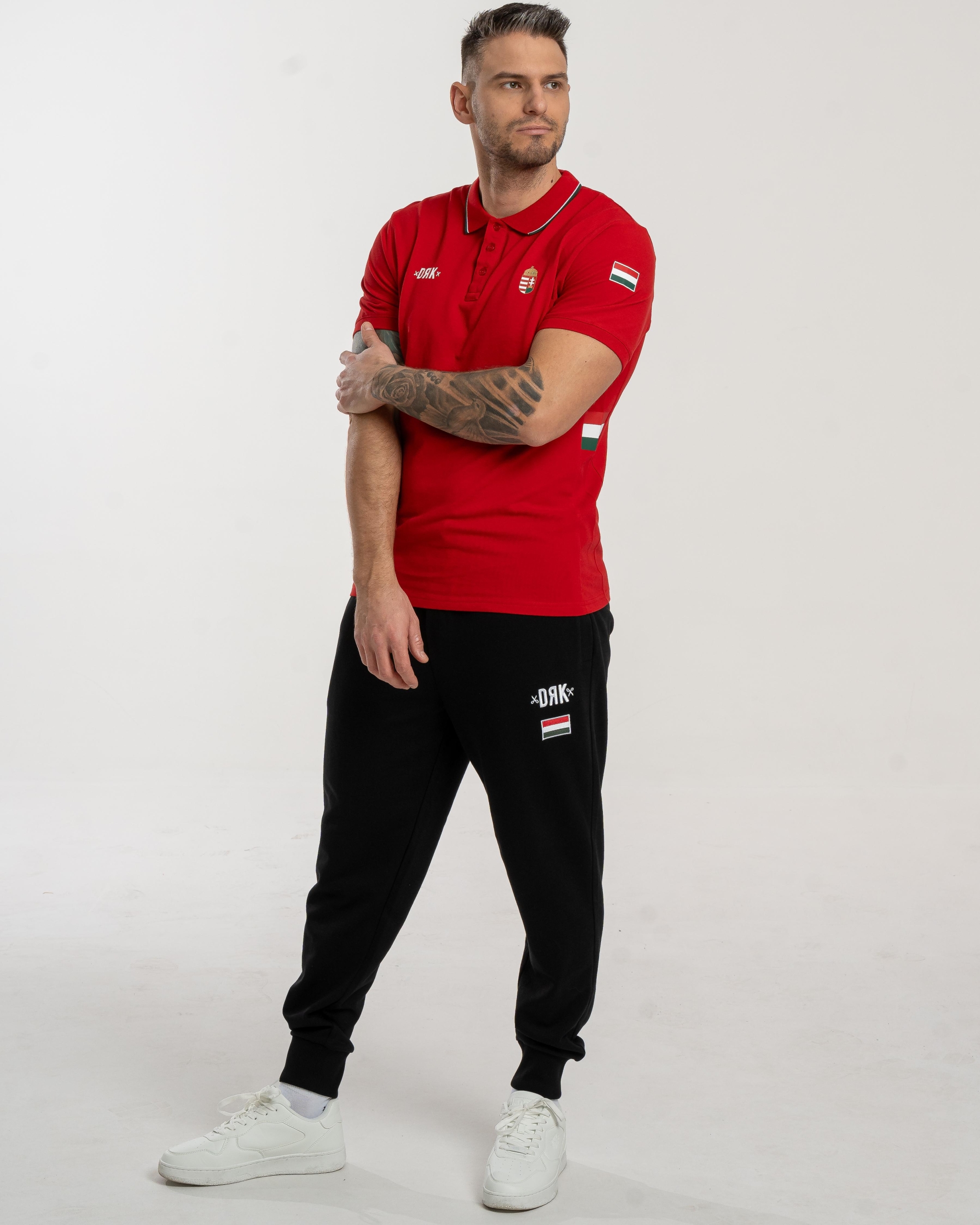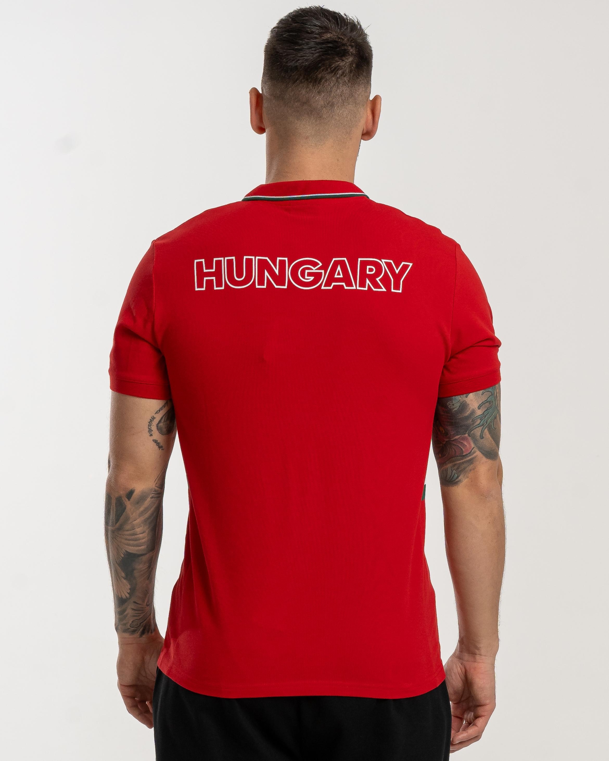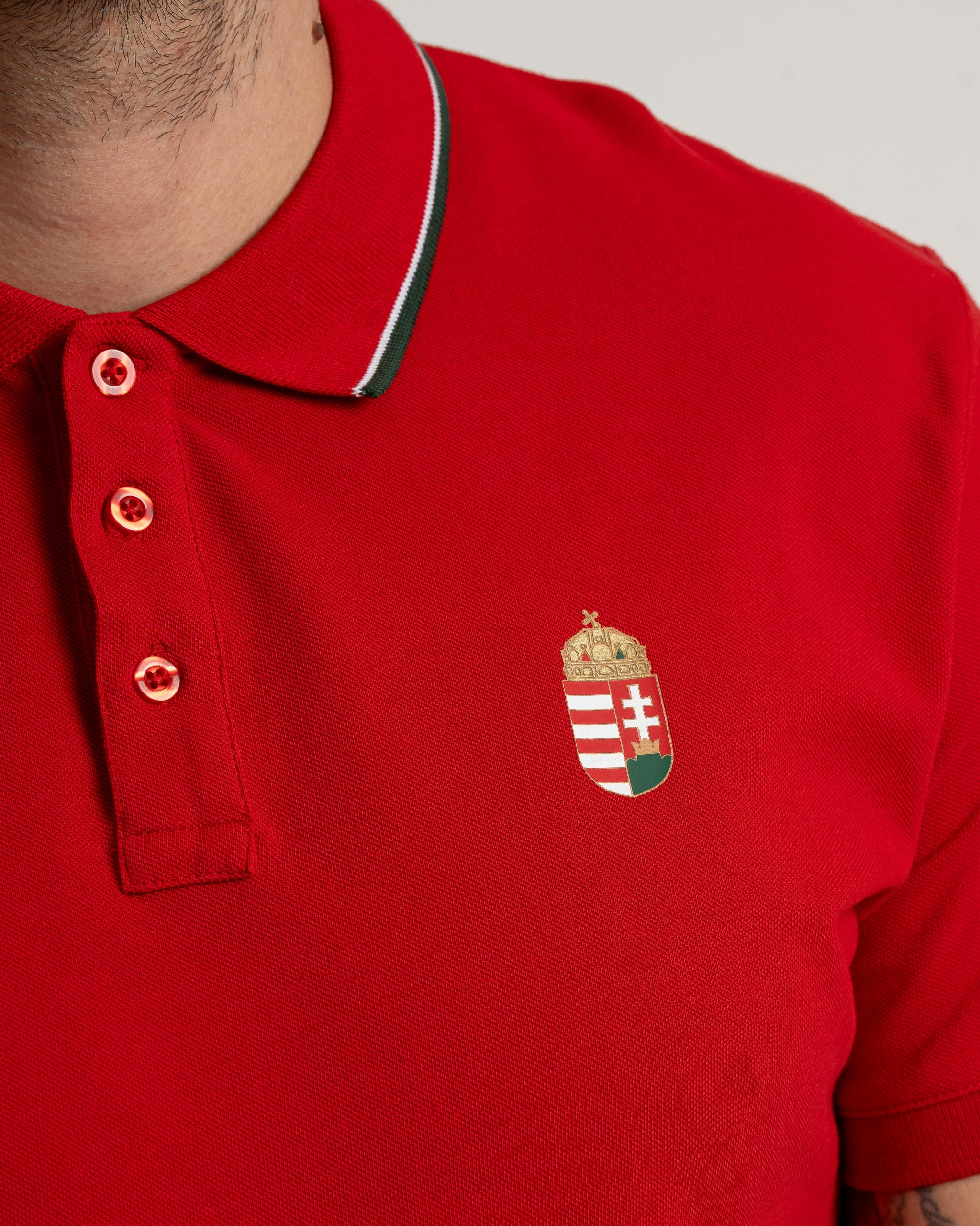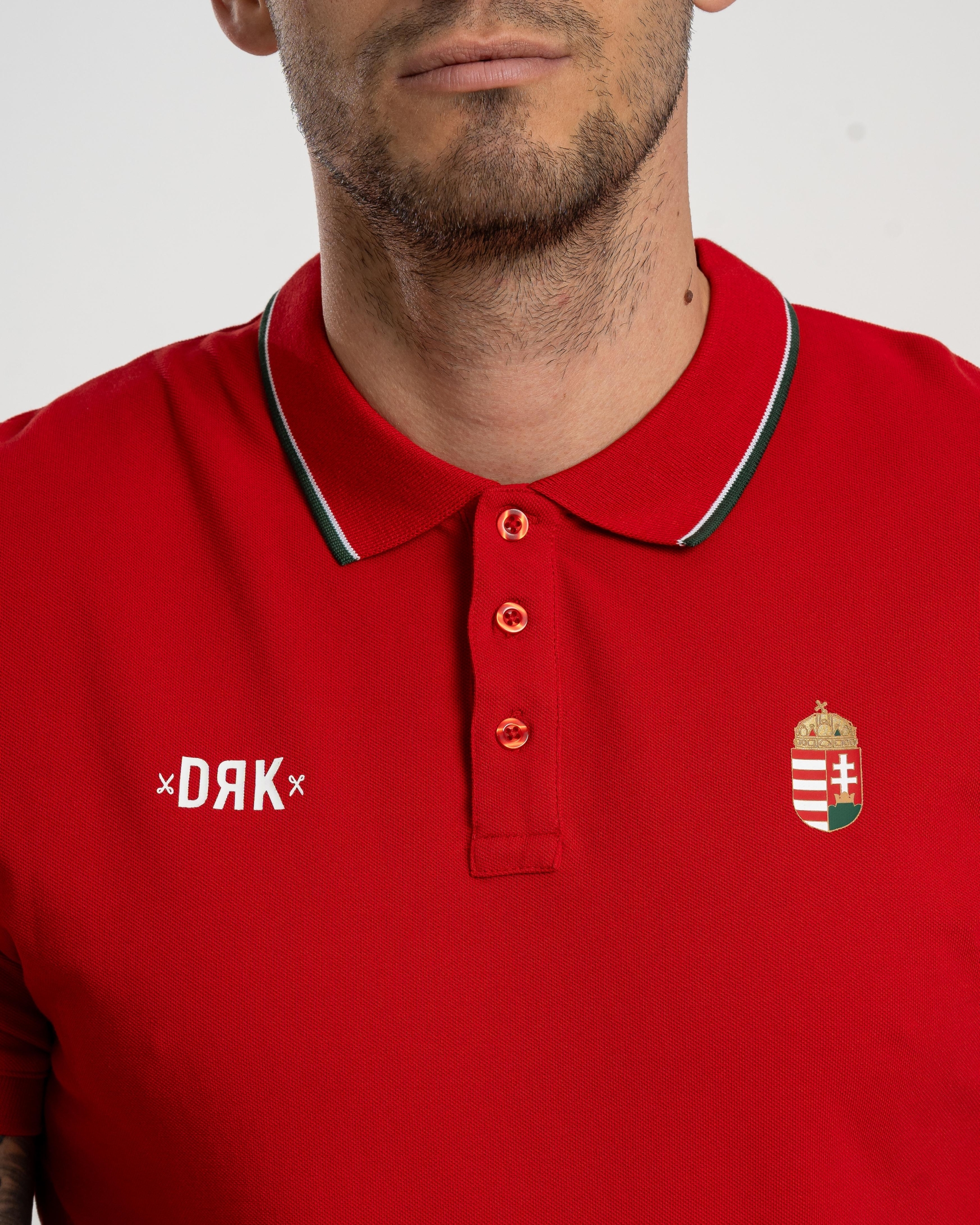 Tricou pique cu aspect elegant, cu guler, cu motive naționale elegante. Dispune de un inserat de culoare națională pe lateral, care se armonizează cu dunga decorativă care rulează pe pasajul tricotat elastic. Fabricat din bumbac 100%, acest tricou confortabil se potrivește perfect în colecția de podium Dorko Ungaria.