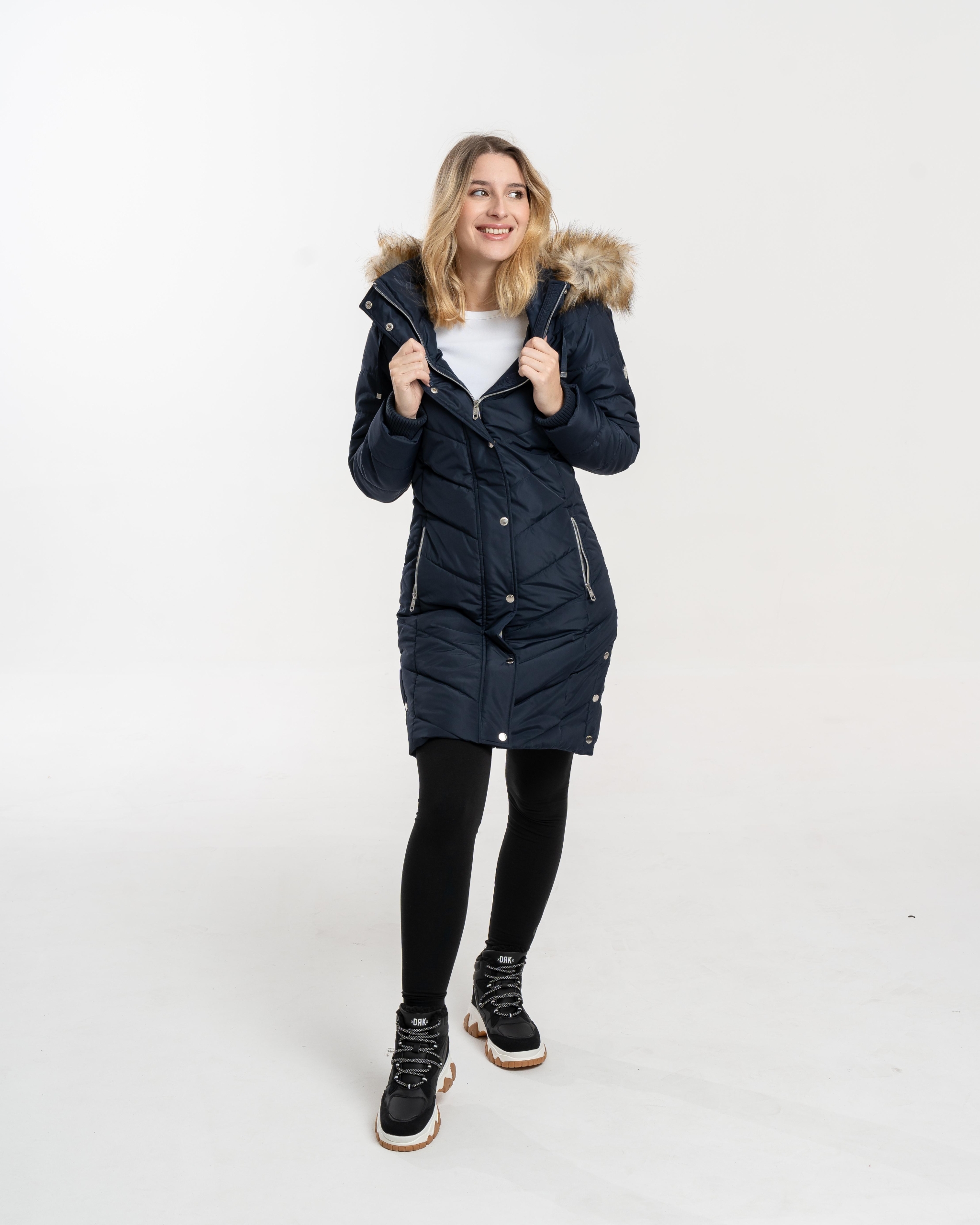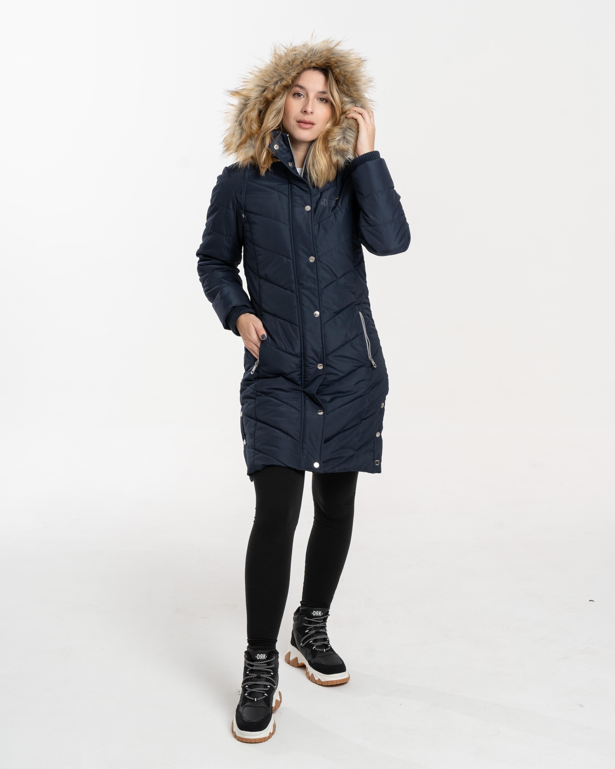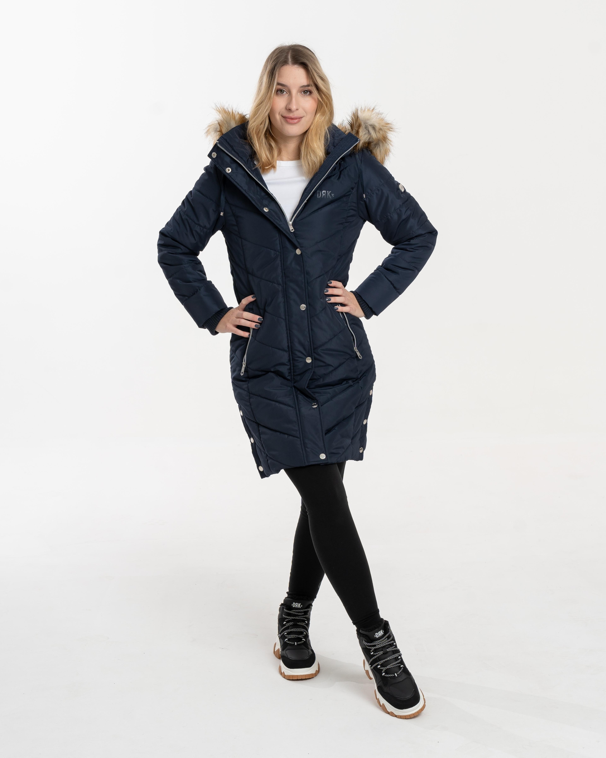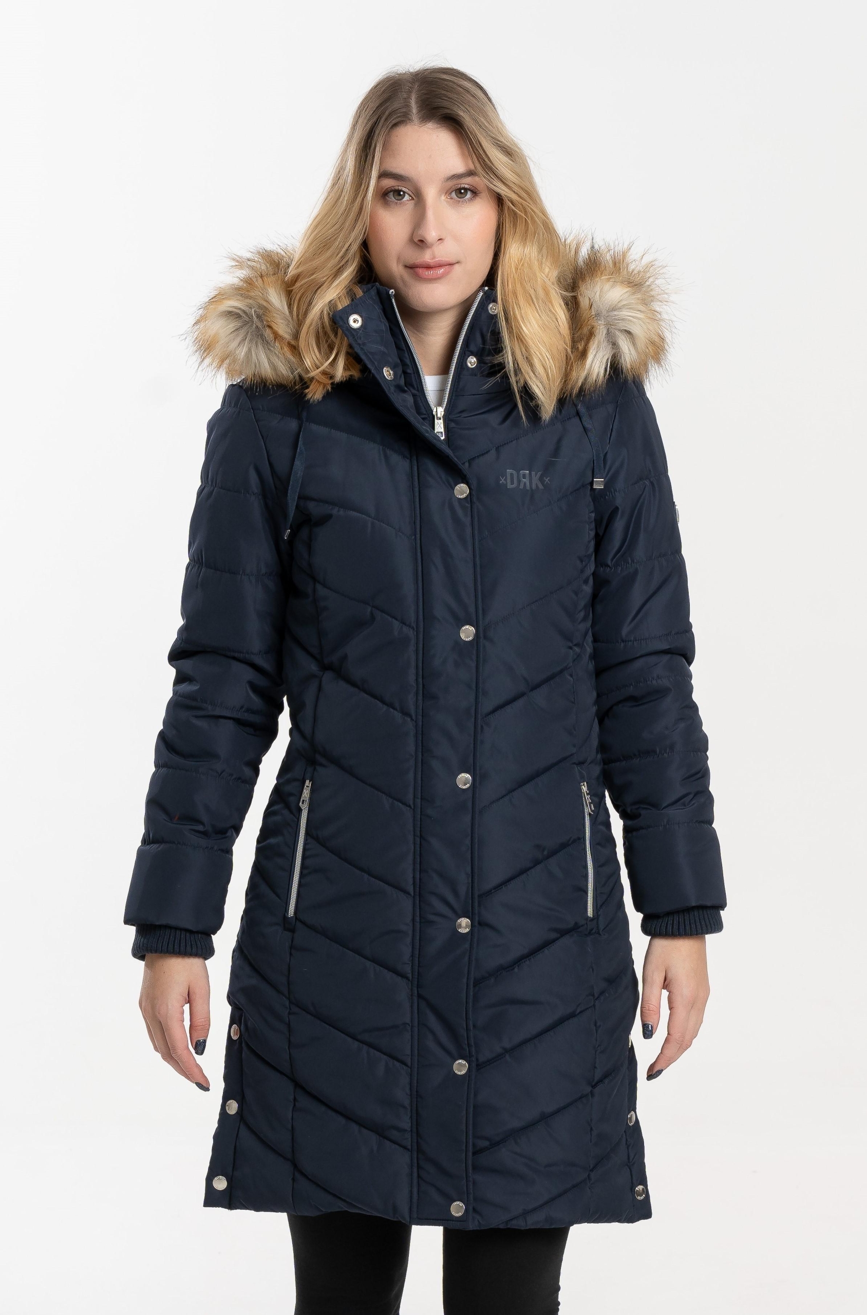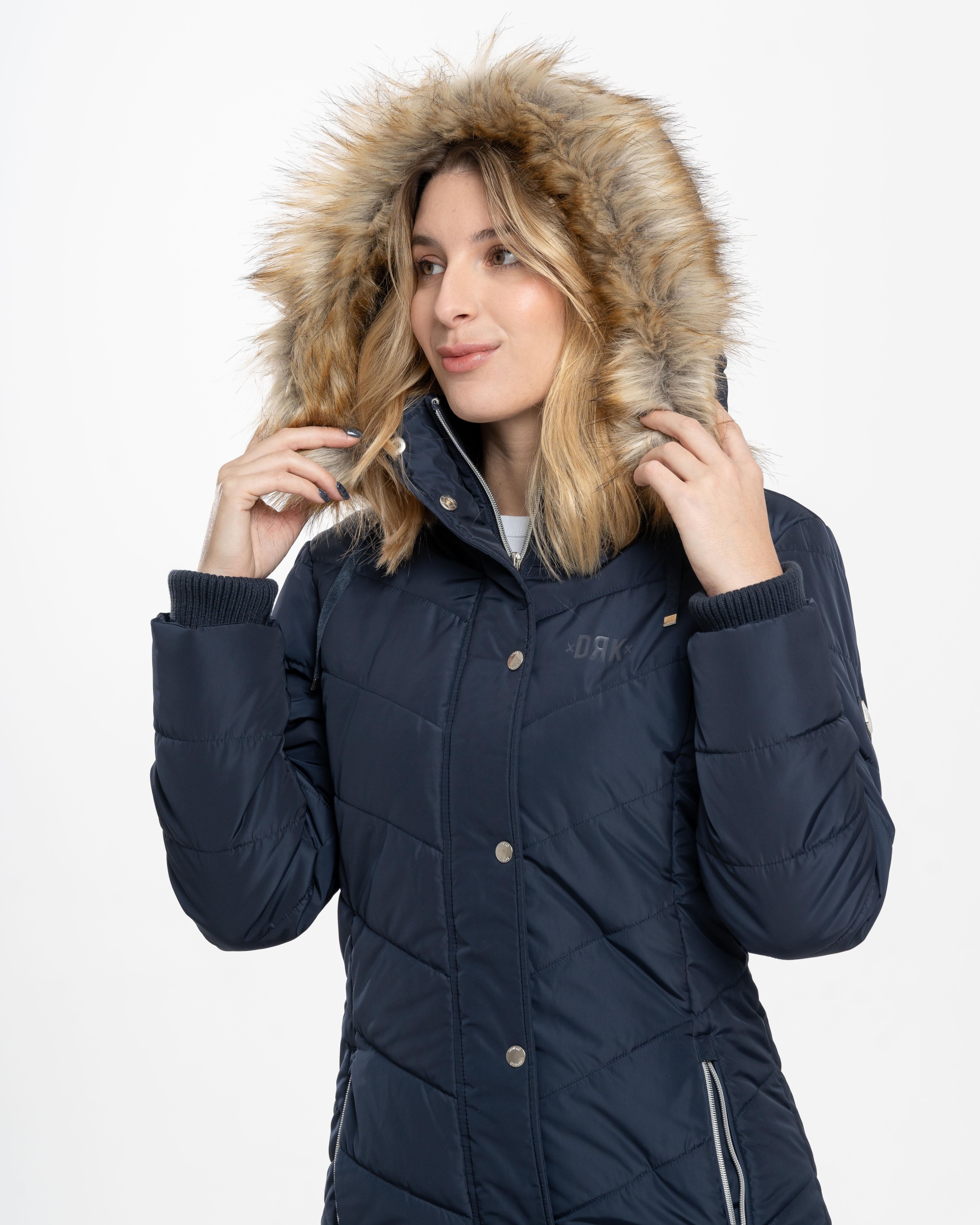 Confecționată din material 100% poliester, jacheta de iarnă pufoasă DRK NENA slim-fit este o alegere elegantă și călduroasă pentru sezonul de iarnă. Logo-ul imprimat cu cauciuc lucios și logo-ul imprimat cu metal de pe brațul superior stâng îi conferă un aspect modern, în timp ce nasturii și fermoarul cu logo ridică și mai mult stilul jachetei. Gluga din blană este detașabilă pentru o purtare versatilă, în timp ce croiala tricotată asigură o purtare confortabilă și protecție suplimentară împotriva frigului.