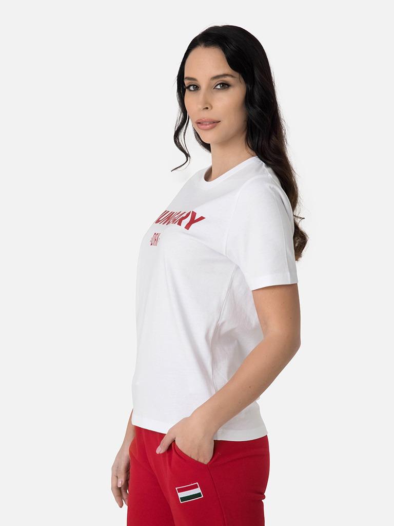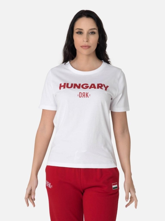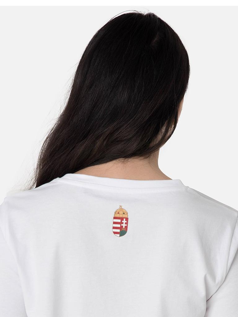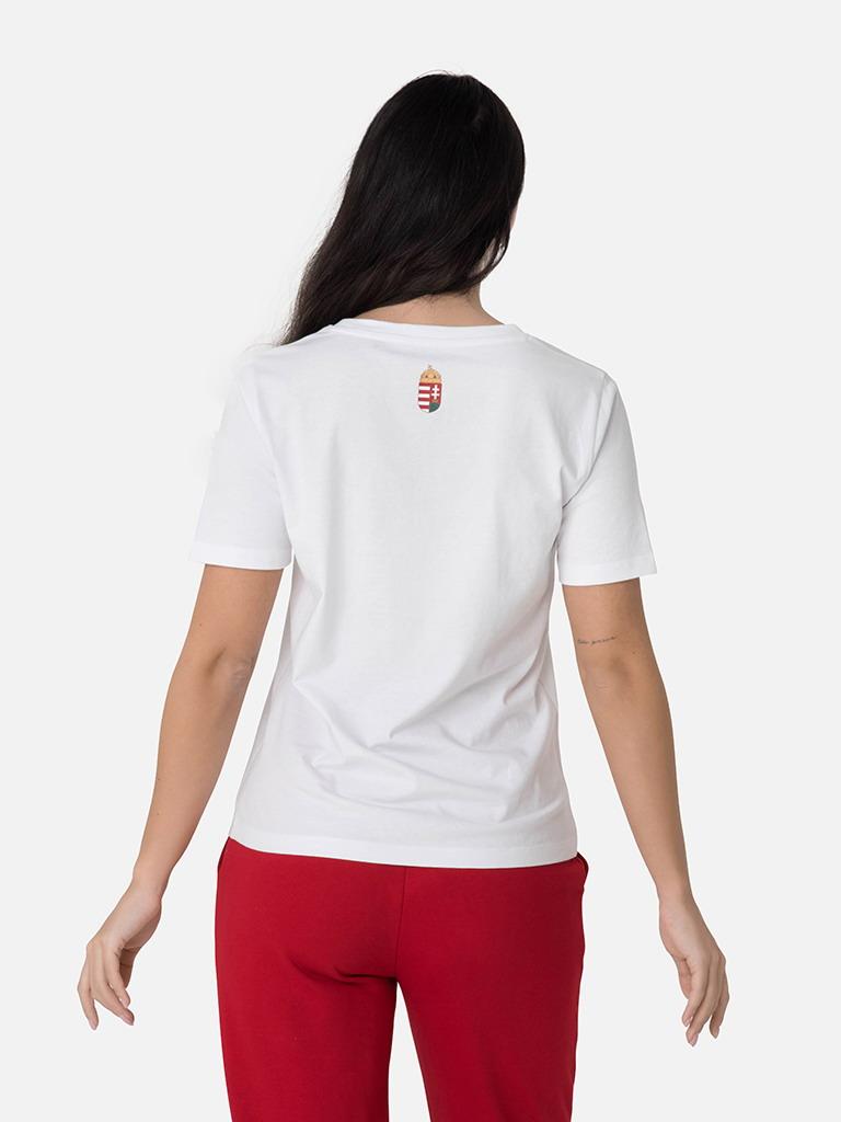 Cămașă de majoretă extrem de confortabilă și elegantă din țesătură 100% bumbac. Dispunând de un gât rotund cu o potrivire clasică. Branding și inscripții HUNGARY pe față, creastă elegantă la gât. Disponibil și în roșu și alb, acest tricou este un adevărat jolly joker în garderoba oricărui suporter hotărât.